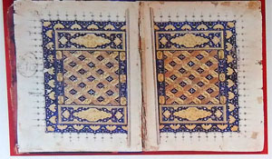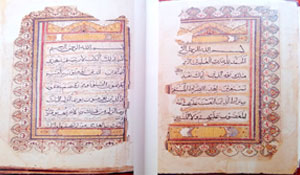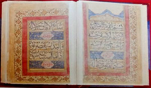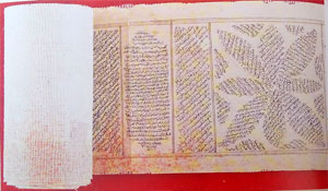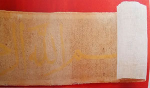 This scroll is a copy of the holy Quran and shows minute calligraphy in ink and bold calligraphy in gold.
